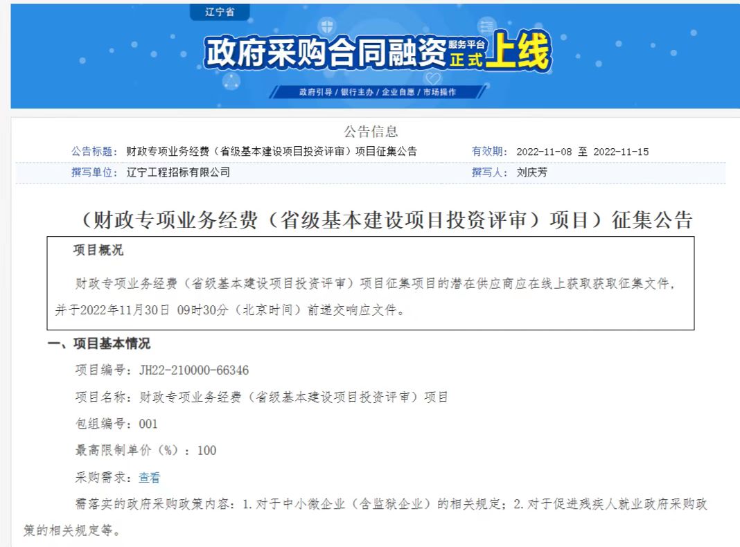 【概要描述】? ? 遼寧工程招標有限公司受遼寧省財政廳的委托,代理的“專項業(yè)務(wù)經(jīng)費(省級基本建設(shè)項目投資評審)項目”采購工作圓滿完成。該項目是遼寧省首個委托社會代理機構(gòu)實施的省本級框架協(xié)議采購項目,對于全省框架協(xié)議采購工作具有引領(lǐng)示范作用。